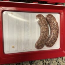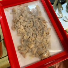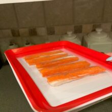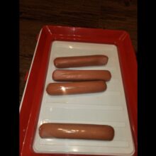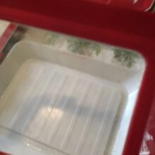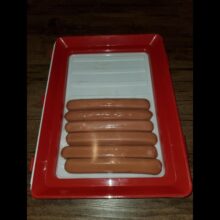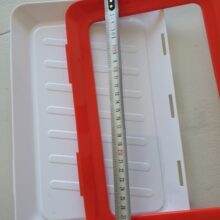 Our trays are made of polypropylene plastic, with the wrap being advanced elastic film. All trays are white with a red border frame for the film cover. Each tray measures 9 x 12 x 1.14 inches (L x W x H).